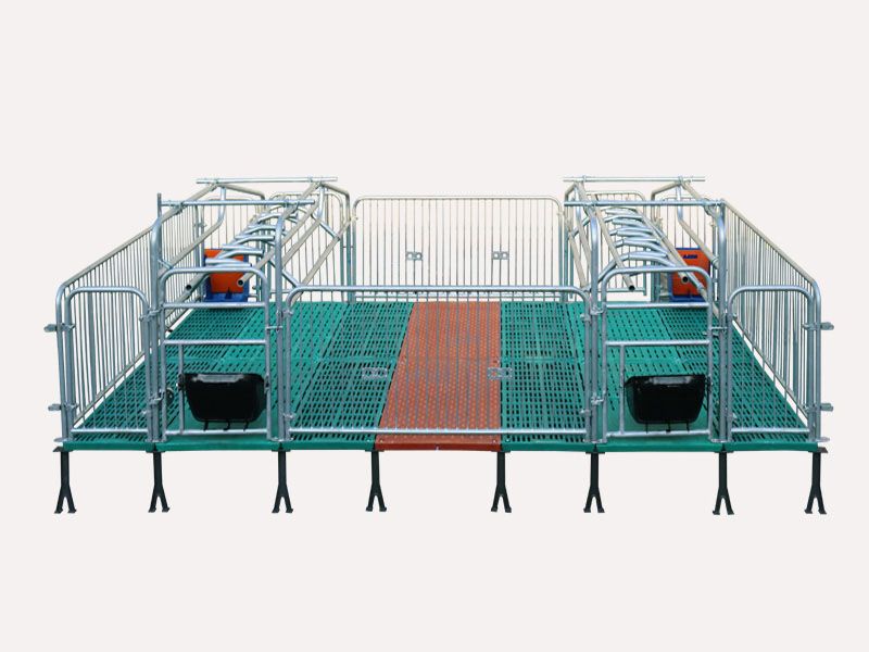 新型母豬產床專為母豬分娩和哺乳仔豬而設計,噴塑雙體母豬產床底架四周使用100mm的槽鋼,角鐵額外加了45*45mm的加腳;專用圍欄就是為了能保護好仔豬,防止被母豬壓傷;能為初生的小豬提供30左右的氣候和環(huán)境;能夠提供良好的衛(wèi)生條件,并能有效的防止食物積存和細菌的繁殖,減少仔豬病疫;便于對母豬和仔豬的管理和養(yǎng)護